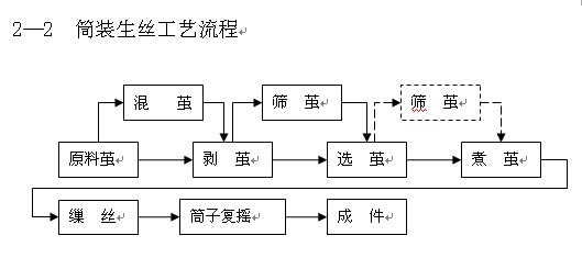 為便于儲存保管,桑蠶鮮繭需經(jīng)過殺蛹、達(dá)到一定干燥程度的烘干處理,將鮮繭處理為含潮率在13%左右的干繭,再進(jìn)入工廠倉庫儲存?zhèn)溆谩_@里僅介紹白廠絲的工藝流程。按白廠絲包裝形式的不同,制絲工藝流程如下圖示: