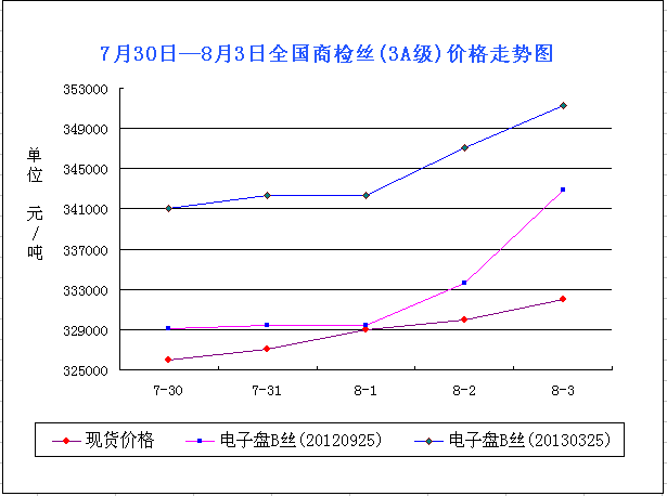 從圖表可以看出,本周現(xiàn)貨市場行情不錯(cuò),基本呈直漲局面,且勢頭穩(wěn)固。本周價(jià)格:國內(nèi)3A級商檢絲現(xiàn)貨均價(jià)周初329100元/噸左右,隨后價(jià)格大漲,周末均價(jià)在342900元/噸左右,整體漲13800元/噸,漲勢較大。在經(jīng)過前期持續(xù)的疲軟后,繭絲市場在近兩周內(nèi)開始了反彈走高,且在本周市場達(dá)到更高位,綜合來看,這與原料生產(chǎn)有關(guān),隨著夏繭的逐漸沒落,新繭工作已經(jīng)基本結(jié)束,而秋繭市場還要待時(shí)日,這中間就出現(xiàn)了一個(gè)斷層點(diǎn)——從企業(yè)到市場都會(huì)受到一定影響,企業(yè)的常規(guī)生產(chǎn)機(jī)需要消耗更多的原料來維護(hù),雖然補(bǔ)庫在前一段時(shí)間曾出現(xiàn),但有企業(yè)在前一段時(shí)間處于觀望中,而到如今由于生產(chǎn)需求,將再次補(bǔ)庫,而握有原料的企業(yè)或者商家便會(huì)提高價(jià)格,對于市場造成上行影響;另外,常規(guī)的絲綢消費(fèi)季在一定程度上起到重大作用,夏季炎熱的天氣是繭絲綢品以及絲綢床品暢銷的季節(jié),產(chǎn)品的暢銷影響了企業(yè)的生產(chǎn)積極性,市場走高。但綜合整體來看,受出口形式嚴(yán)峻的影響,繭絲綢行業(yè)要像有強(qiáng)力支撐,短期內(nèi)還未形成趨勢,并且此間的價(jià)格區(qū)間已經(jīng)不錯(cuò),高低都對行業(yè)不利。并且不論是大宗市場還是紡織市場,如今環(huán)境都不樂觀,因此繭絲綢市場應(yīng)謹(jǐn)慎而行。