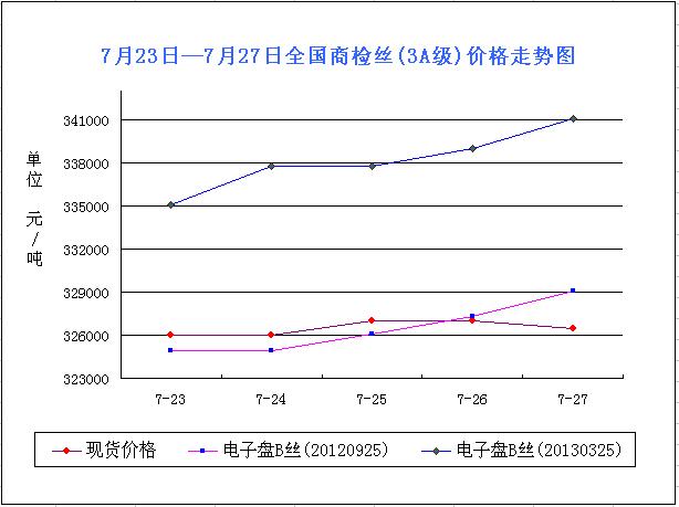 從圖表可以看出,本周現(xiàn)貨市場(chǎng)變化不大,基本都在32.6萬(wàn)/噸偏右徘徊,整體價(jià)格位和上周幾乎沒(méi)有差別,唯一變化的而就是本周市場(chǎng)交易再現(xiàn)冷清,大概是經(jīng)過(guò)幾周的漲價(jià)之后,市場(chǎng)開(kāi)始平靜,甚至開(kāi)始回調(diào)。本周價(jià)格:國(guó)內(nèi)3A級(jí)商檢絲現(xiàn)貨均價(jià)周初326000元/噸左右,隨后價(jià)格小漲,周末均價(jià)在326500元/噸左右,整體漲500元/噸。綜合現(xiàn)在的價(jià)格來(lái)看,繭絲市場(chǎng)行情到現(xiàn)在這個(gè)價(jià)位已經(jīng)不錯(cuò),不論對(duì)于下游綢廠服裝廠等,價(jià)格成本上壓力也沒(méi)那么大了,如果價(jià)格能一直這樣平穩(wěn),那么繭絲綢業(yè)將會(huì)朝向更好的方向發(fā)展;對(duì)于上游來(lái)講,絲廠的利益和絲價(jià)繭價(jià)緊密相關(guān),而繭子的價(jià)格又和蠶農(nóng)的收入相連,因此來(lái)講,本年來(lái),干繭收購(gòu)價(jià)格整體不差,對(duì)蠶農(nóng)來(lái)說(shuō),收入中規(guī)中矩。另外產(chǎn)量,隨著春繭,夏繭的逐步結(jié)束,市場(chǎng)歸于一方面的平靜也在清理之中,因此近期繭絲市場(chǎng)可謂平靜不少,漲價(jià)主要原因則受絲綢消費(fèi)季的影響,炎熱夏季,正是絲綢產(chǎn)品的熱銷季節(jié),很多人都會(huì)在這個(gè)季節(jié)選擇絲綢服飾以及絲綢家居服等,另外絲綢家紡床品也開(kāi)始熱銷。而外圍消息上看,歐美市場(chǎng)依舊如此,唯一值得慶幸的是人民幣對(duì)美元匯率有所緩解,此點(diǎn)對(duì)于以出口為主的繭絲綢業(yè)來(lái)講利處不小。