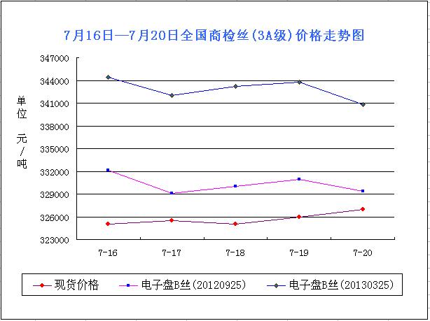 從圖表可知,本周現(xiàn)貨市場(chǎng)漲跌互現(xiàn),整體盤整,價(jià)格位重心上移,較之前段時(shí)間的行情有不小漲幅,而就本周而言,行情較為平淡。從近段時(shí)期的價(jià)格走勢(shì)而言,自新繭基本交售結(jié)束后,繭絲市場(chǎng)便呈現(xiàn)出回暖基調(diào),雖然基本都是處于盤整——漲跌互現(xiàn)的局面,但整體大趨勢(shì)是在上漲,且漲幅近至近日已經(jīng)不小,因此這對(duì)于整個(gè)繭絲市場(chǎng)來講無疑是有后市支撐力的,雖然如今在市場(chǎng)或者企業(yè)間,大多人都處于看空思想,但此一段的行情上漲在一定程度上支撐了市場(chǎng)的走勢(shì)。本周價(jià)格:國內(nèi)3A級(jí)商檢絲現(xiàn)貨均價(jià)周初325000元/噸左右,隨后價(jià)格小漲,周末均價(jià)在327000元/噸左右,整體漲2000元/噸。本周價(jià)格周末已經(jīng)漲至32.5萬/噸以上,這樣的趨勢(shì)來看,33萬/噸很有可能在近日達(dá)到,但33萬/噸的坎卻是很難邁過,行情以后亟需謹(jǐn)慎。從坊間消息得知,近周以來,廣西地區(qū)夏繭收購基本處于尾部,伐桑工作也進(jìn)行的熱火朝天,預(yù)計(jì)近期上半年桑蠶工作將基本結(jié)束,而整體來看,繭絲行情有定型趨勢(shì)