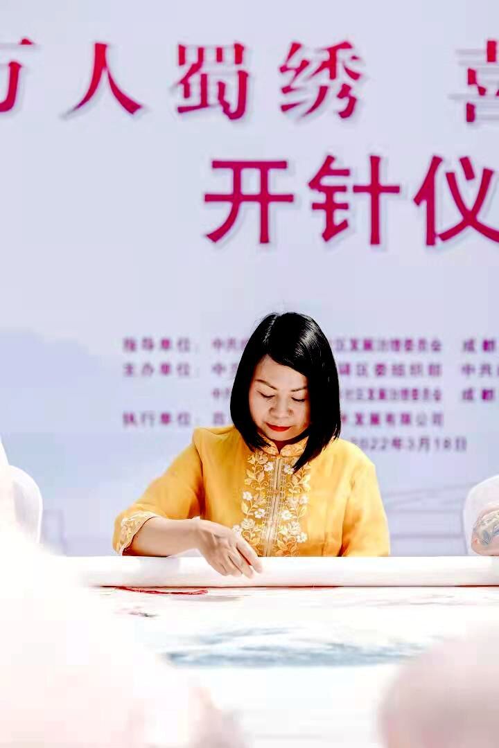 14時,隨著一首耳熟能詳?shù)摹妒窭C》歌曲響起,寓意“錦繡山河波瀾闊,盛世巾幗迎大運”的蜀繡畫作揭開了廬山真面目。20名龍泉驛區(qū)本土繡師在國家級蜀繡大師孟德芝的帶領(lǐng)下沐手、靜心,由孟大師率先開針,繡師們同時起針開繡。她們用一針一線繡出了蜀繡源遠流長的文化底蘊,用一絲一縷記錄了喜迎大運盛事、編織幸福生活的美好期許。