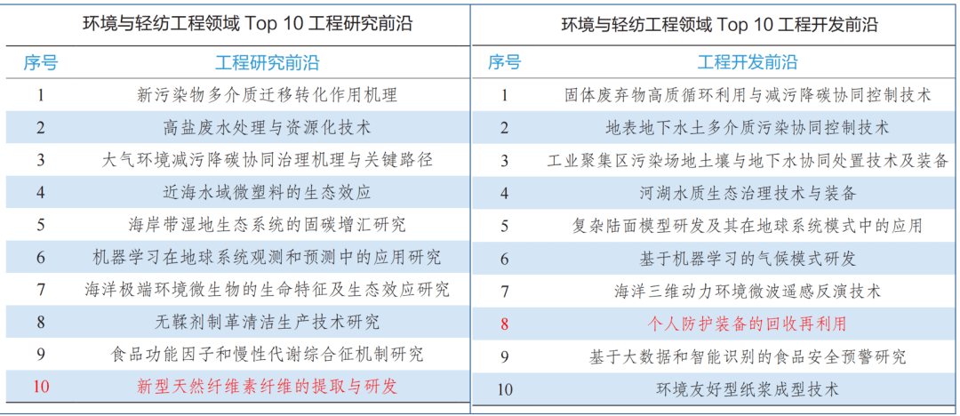 12月15日,中國(guó)工程院、科睿唯安和高等教育出版社在北京聯(lián)合發(fā)布 《2022全球工程前沿》報(bào)告。報(bào)告圍繞機(jī)械與運(yùn)載工程、信息與電子工程、化工冶金與材料工程、能源與礦業(yè)工程、土木水利與建筑工程、環(huán)境與輕紡工程、農(nóng)業(yè)、醫(yī)藥衛(wèi)生、工程管理9個(gè)領(lǐng)域,遴選出年度工程研究前沿95項(xiàng)和工程開(kāi)發(fā)前沿93項(xiàng)。其中, 新型天然纖維素纖維的提取與研發(fā)、個(gè)人防護(hù)裝備的回收再利用兩項(xiàng)紡織技術(shù)入選。